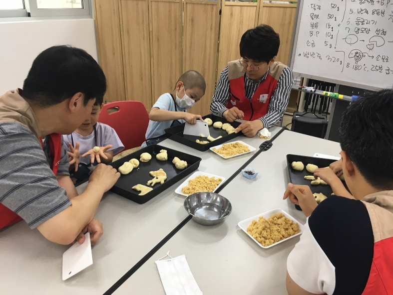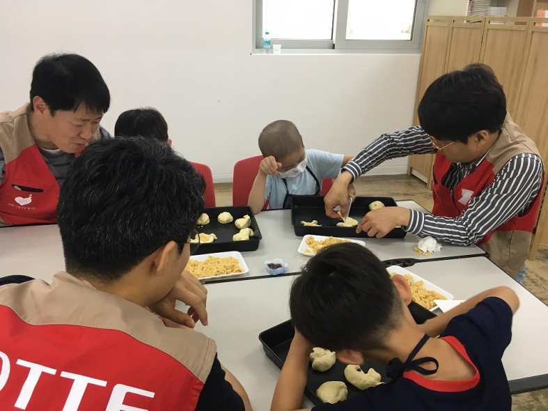처음 만난 롯데카드 봉사 선생님들과의 어색한 분위기도 잠시, 금세 선생님들 도움을 받아 소보루빵 만들기에 집중했던 우리 친구들.