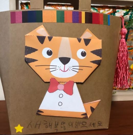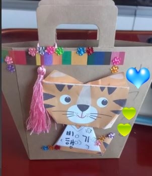 첫 수업은 '열두띠 동물이야'라는 책을 읽고 띠에대해 알아본 후 임인년 호랑이 띠 가방을 만들었습니다.